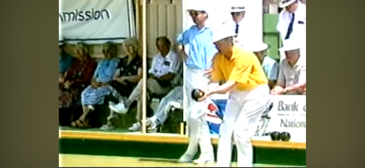 Brett O’Riley lining up before the televised final of the 1992 New Zealand National Bowls singles against Peter Belliss (who won 21-16). Multiple World Bowls champion Belliss was inducted by Brett into the World Bowls Hall of Fame earlier this year. Image Supplied