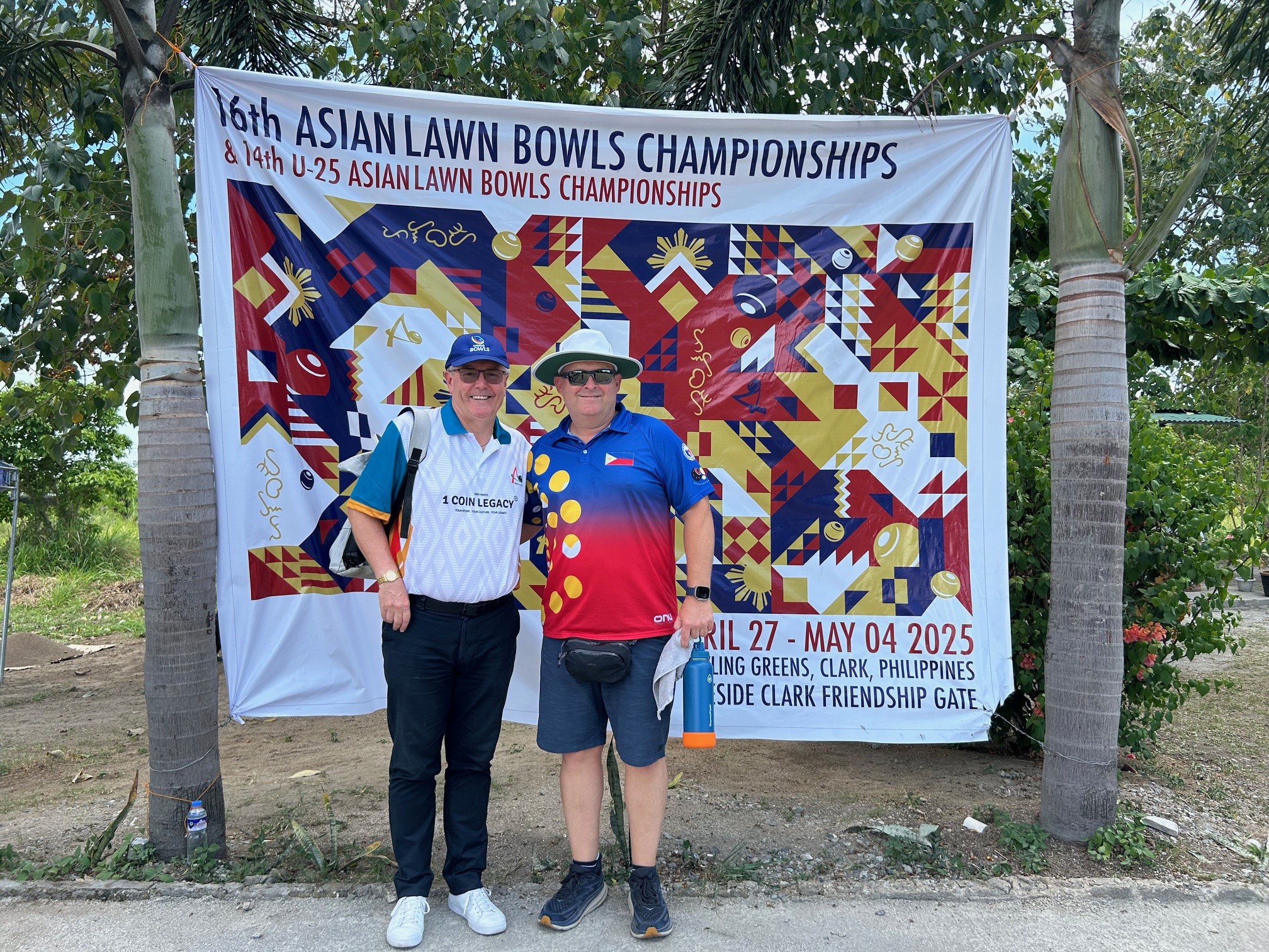 Brett O’Riley at the Asia Bowls Championships in Angeles City, Philippines with event sponsor Bryan Lockyer, a fellow Kiwi who owns and manages a software business based in the Philippines. Image Supplied