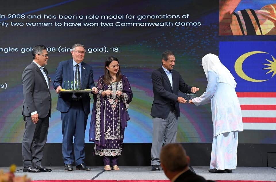 Brett O’Riley alongside Datuk Awalan Abdul Aziz, President of Bowls Malaysia and Asia Bowls, and YB Hannah Yeoh, Malaysia’s Minister of Youth and Sports, at the World Bowls Hall of Fame induction ceremony as HRH Sultan Mizan Zainal Abidin of Terengganu presents a commemorative plaque to Malaysian pioneer Siti Zalina Ahmad. Image Supplied