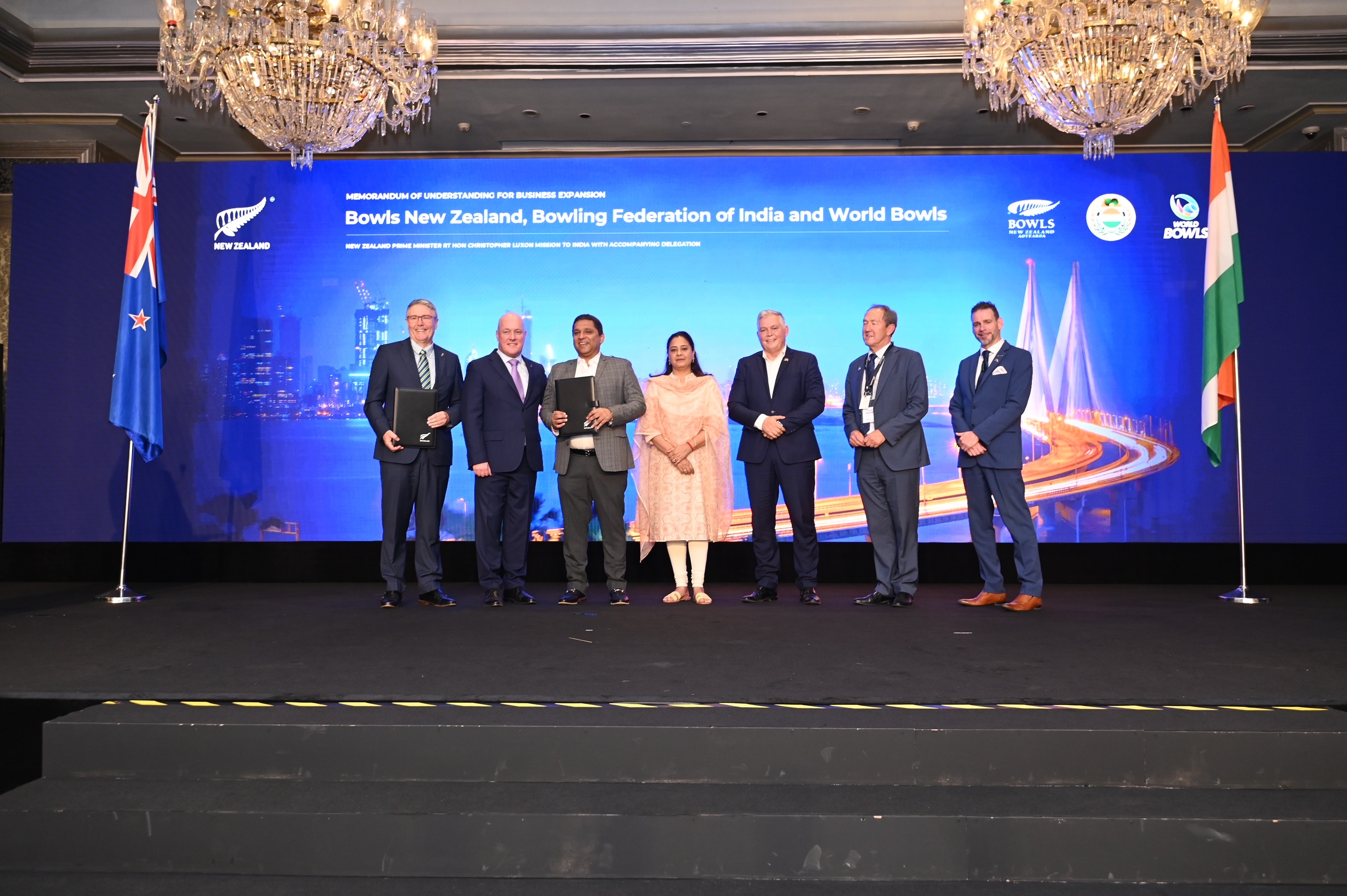 Celebrating the signing in Mumbai of a strategic MOU between the Bowling Federation India, Sunaina Kumari and President Ravi Bengani, Bowls New Zealand Aotearoa and World Bowls during PM Rt Hon Christopher Luxon’s delegation to India, Minister of Sport Hon Mark Mitchell, SportNZ Ambassador Peter Miskimmin and NZTE’s Graham Rouse. Image Supplied
