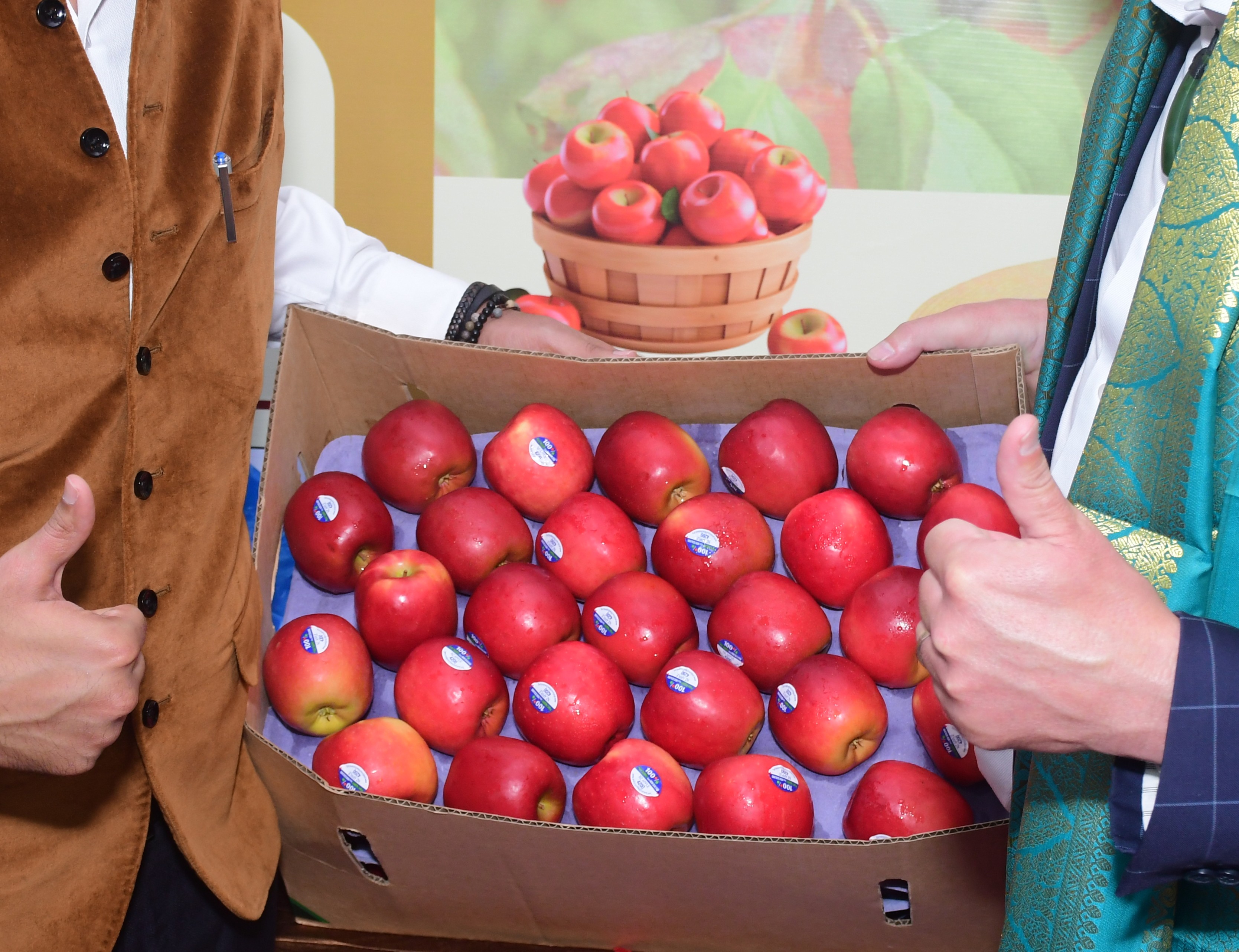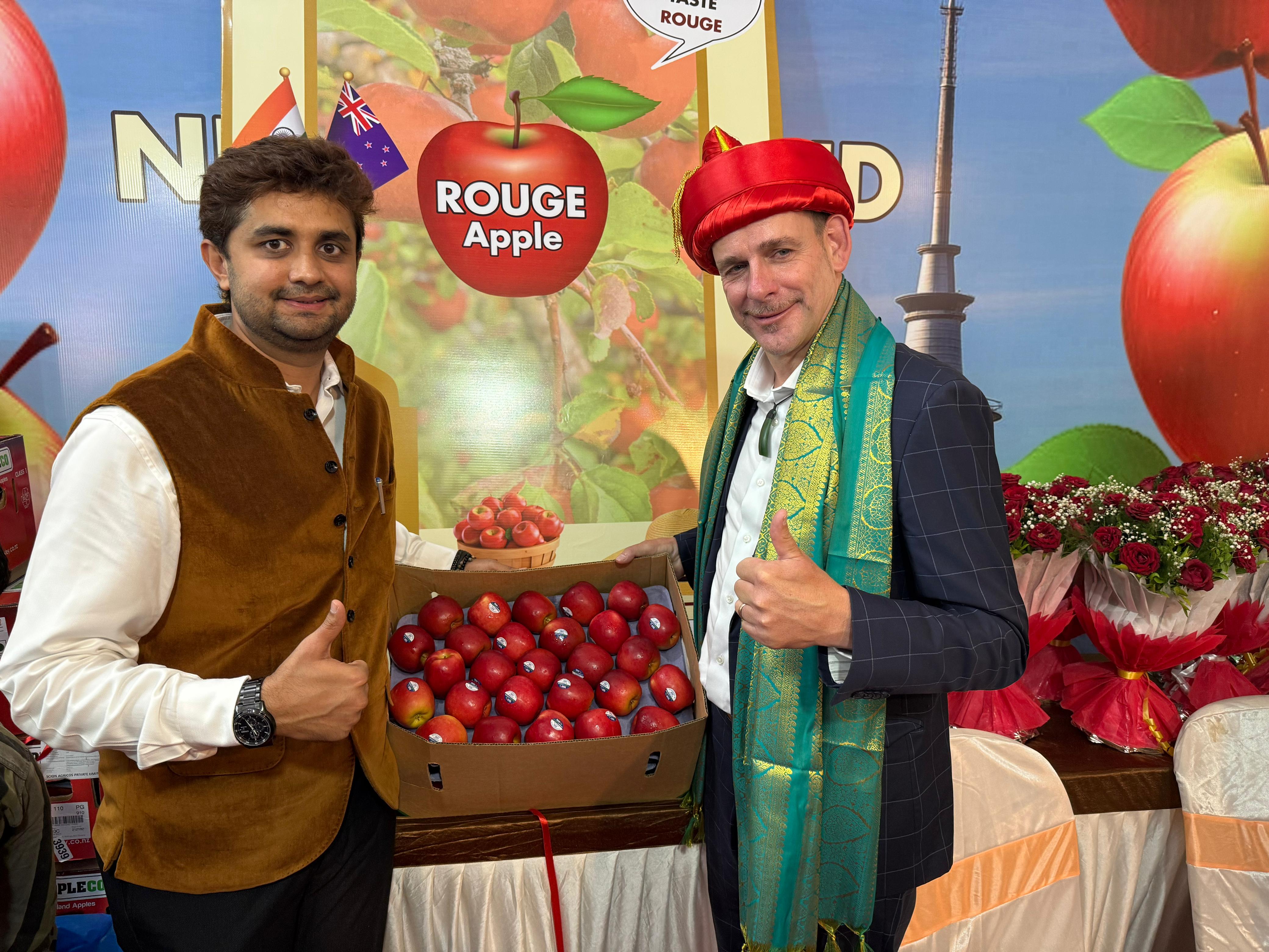 New Zealand’s Hawke’s Bay Rouge apples were launched in India on September 4, 2025, (left) Rohan and NZ Consul General for India Hon, Mr . Image: Rohan Satish Ursal.