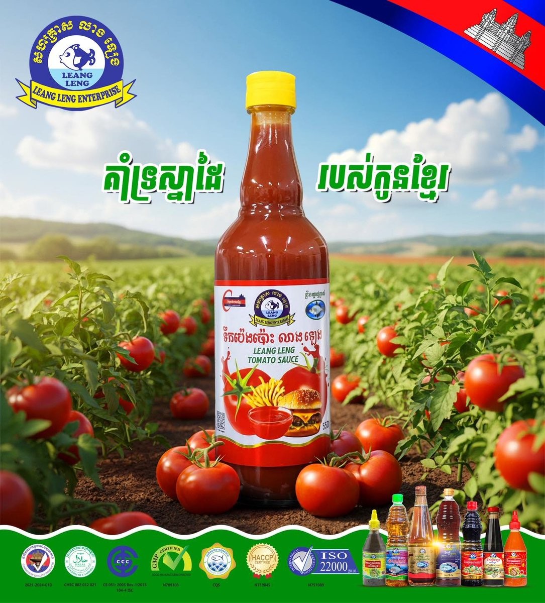 (In photo - A vibrant display of Leang Leng Enterprise's tomato sauce bottles in a field, emblazoned with the Cambodian flag and "Buy Khmer, Use Khmer" slogan, fuels anti-import nationalism. Image supplied/amc)