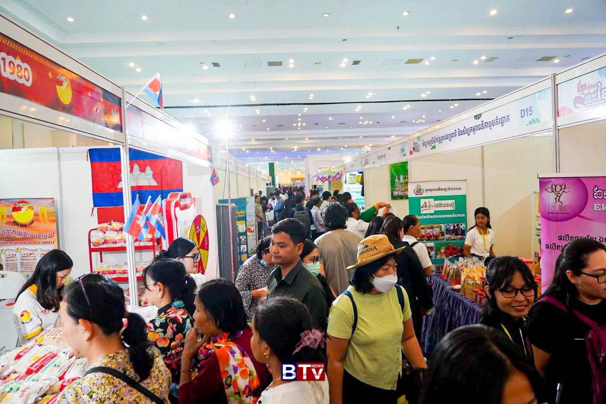 Visitors tour the "Khmer Can Do" exhibition, clapping amid booths showcasing local products. Image supplied/amc